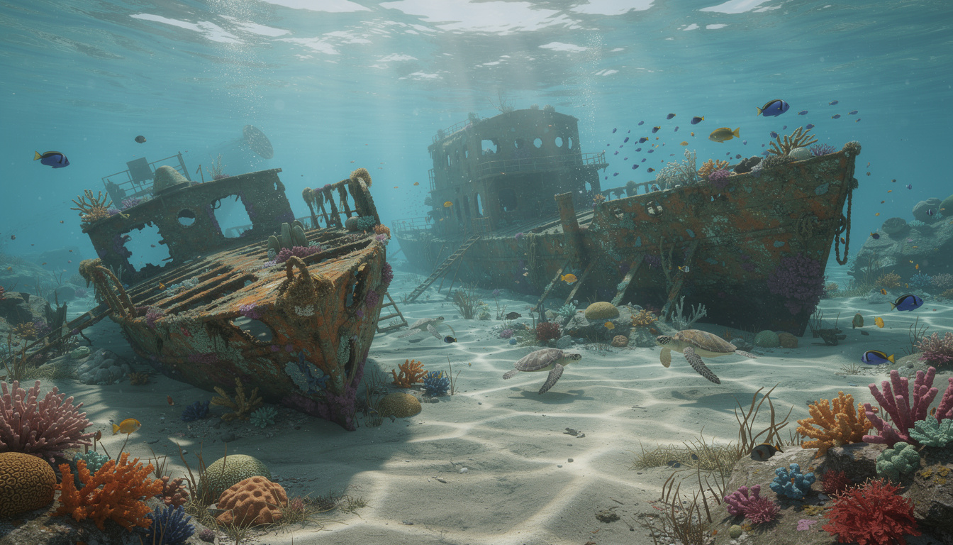 Les épaves de Carlisle Bay sont autant d’archives en fer et en bois où la faune marine a tissé son récit : mérous, tortues et bancs de poissons animent les structures creuses. Le regard du bibliothécaire s’attarde sur les détails — une hélice figée, une plaque illisible, des animaux qui colonisent les cales — comme autant d’indices pour recomposer le passé marin. 📚